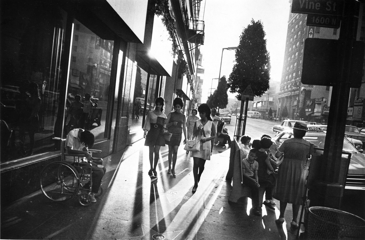 Is that what is happening with the famous ‘Winogrand Tilt’? The brilliant photographer prided himself on his reactions in capturing the street; he loved basketball and had his own camera moves: ‘You should see my turnaround jumper.’ Gary Winogrand‘s imagery exhibits virtuoso mastery of the peripheral. He favoured the wide-angle lens, a 28mm or even a 21mm, and in using it to make Hollywood Boulevard 1969, he spectacularly and shocking relocates The Judgement of Paris to Los Angeles where haloed Hera, Athena and Aphrodite tread the stars of now tawdry Hollywood Walk of Fame appraised now by a very mortal man in a wheelchair who sits in for the shepherd Trojan, Paris.