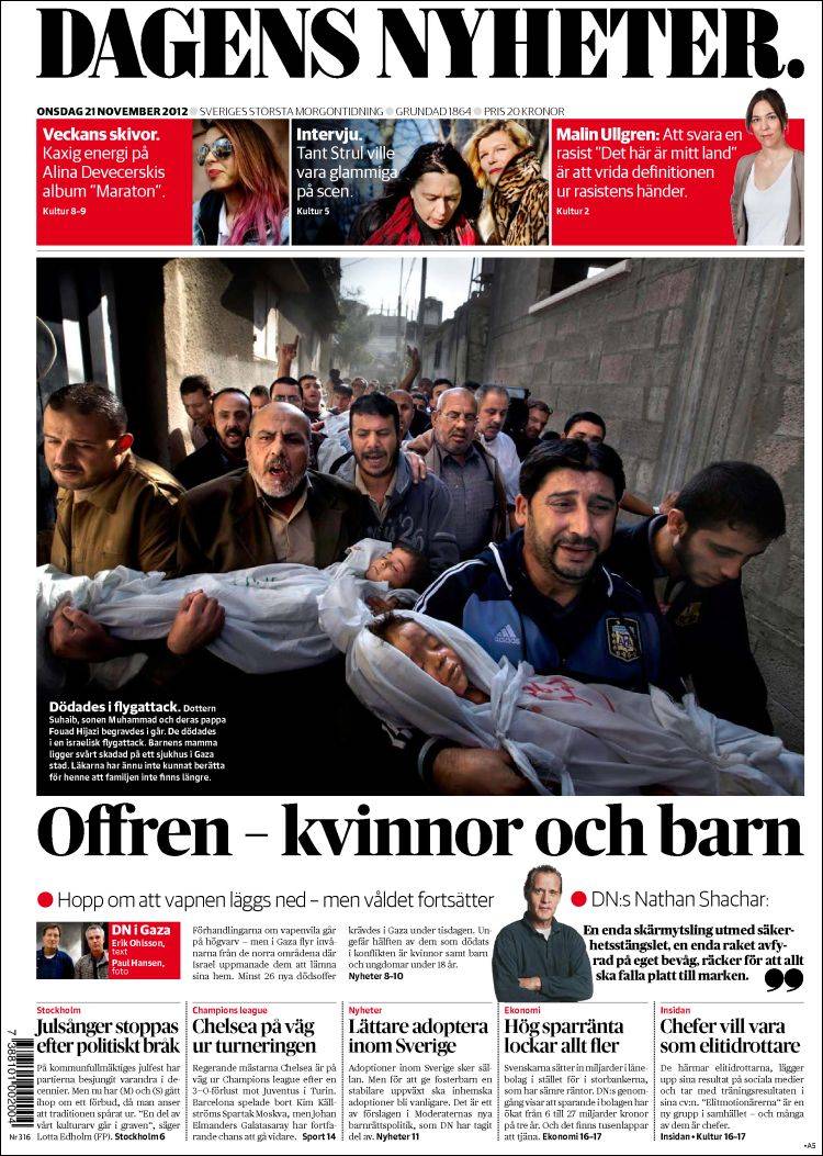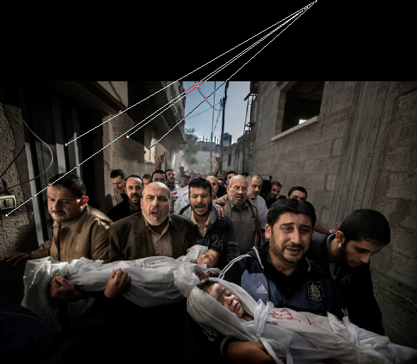 The case in point is Paul Hansen, Sweden, photographer for Dagens Nyheter who won 2013 ‘Press Photo of the Year’ for his emotionally powerful 20 November 2012 image of mourning uncles carrying the corpses of two-year-old Suhaib Hijazi and her three-year-old brother Muhammad killed when an Israeli missile strike destroyed their house.